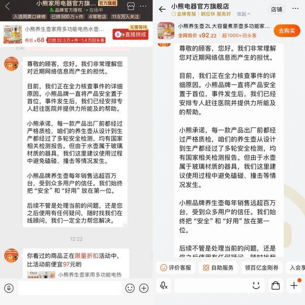 关于记者对作为消费者的“健康锅爆炸”事件的质疑,上面的官方商店的客户服务也发布了相同的答复: